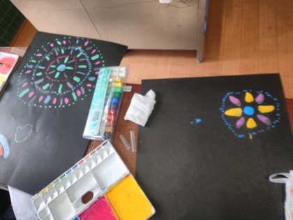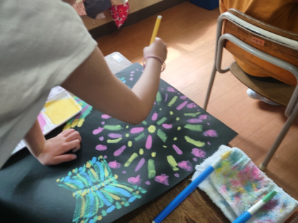 図工科の時間は、好きな4色の絵の具をパレットに出し、白をまぜてきれいな色を作り、筆先をうまく使って、黒い画用紙に花火を描いていきました。