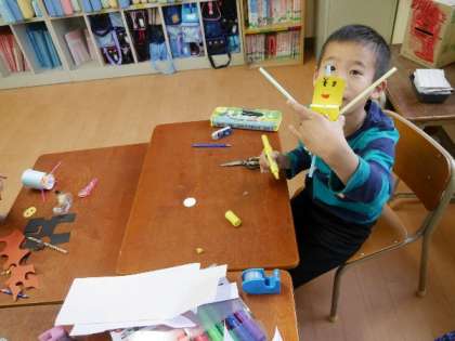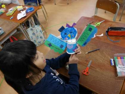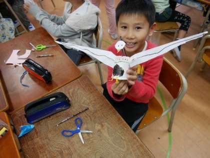 2年生が、紙コップとストローで楽しそうにのびのびと作品を作っています。ストローを動かすと鳥の羽がはばたくんですね。