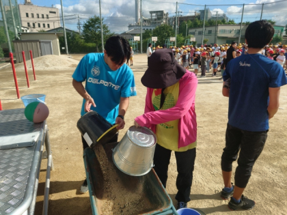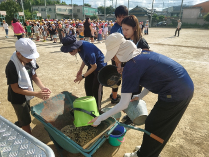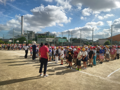 今日の集会の時間は、運動会に向けて全校児童が運動場の石拾いをしました。