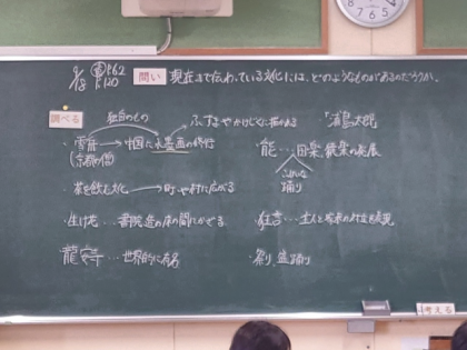 社会科の時間は、室町時代から現代に伝わる文化にはどのようなものがあるのか調べ、なぜ民衆にも広まっていったのかみんなで考えました。