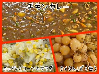 今日の献立は、チキンカレーライス・キャベツとコーンのサラダ・さくらんぼ(缶)・牛乳でした。