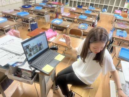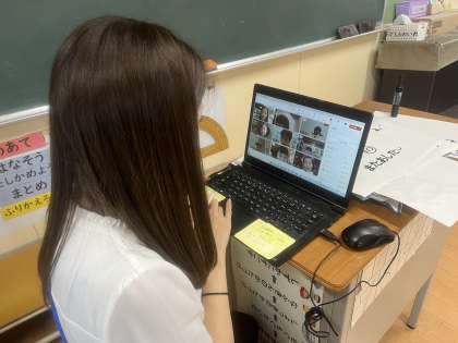 学級ごとに教室と家庭とを結んで、子どもたちと担任がオンラインで会話しました。