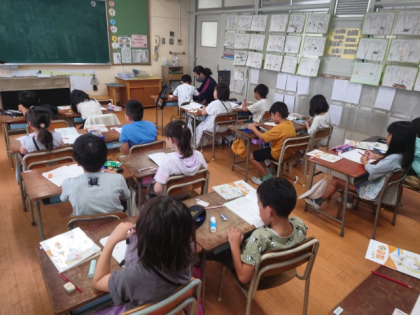 算数科の時間は、「子どもが10人あそんでいました。そこへ2人来ました。また6人来ました。子どもは何人になりましたか。」の問題について、計算の仕方をみんなで考えました。