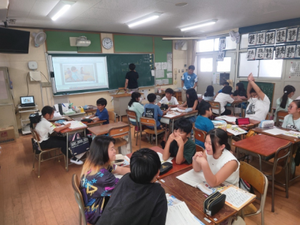 英語科の時間は、"Can you 〜?""Yes I can./No I can't."の表現を使って、学校の先生に「できること」を聞き、3ヒントクイズを作ります。