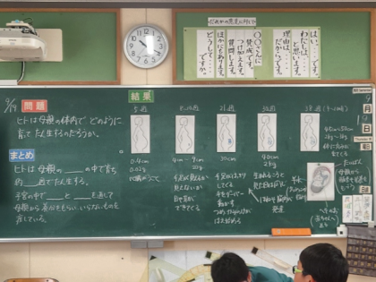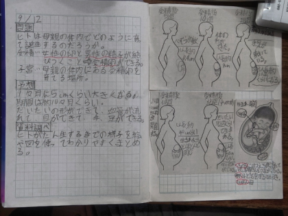 理科の時間は、ヒトは母親の体内でどのように育って誕生するのか調べてノートにまとめました。