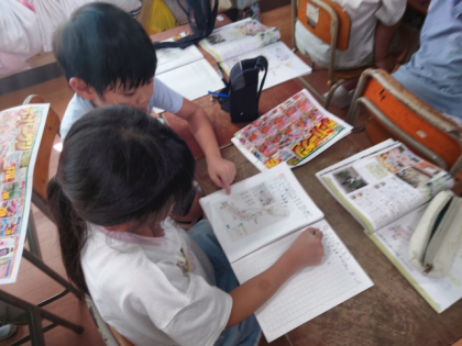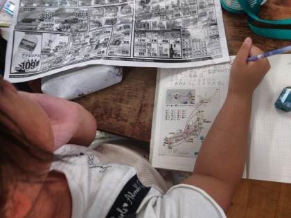 子どもたちは、スーパーマーケットのチラシ広告を見ながら、品物が日本の遠い場所や外国など、いろいろなところから届いていることに気付きました。