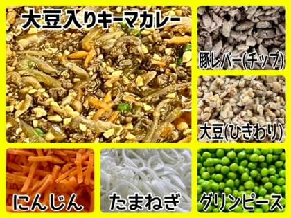 「大豆入りキーマカレーライス」は、牛ひき肉、豚ひき肉、鉄が豊富に含まれている豚レバー(チップ)、大豆(ひきわり)などを使用しています。