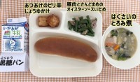 今日の献立は、大豆入りキーマカレーライス・きゅうりのサラダ・洋なし(カット缶)・牛乳でした。