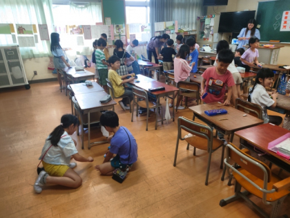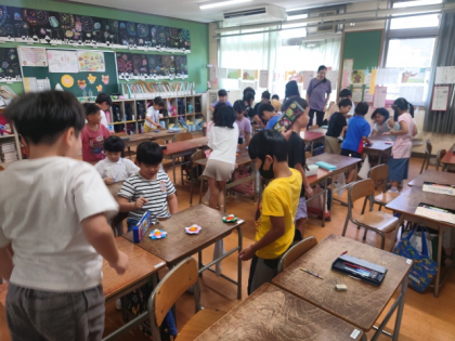 生活科の時間は、折り紙を折って、こまのように回るおもちゃを作り、楽しく遊べるか試してみました。