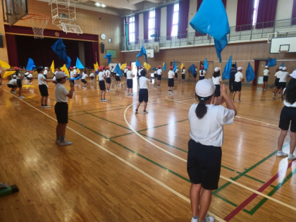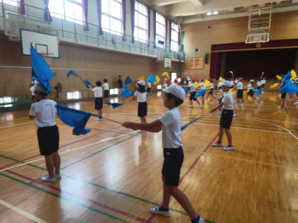 運動会に向けて、団体演技のフラッグの練習をしています。