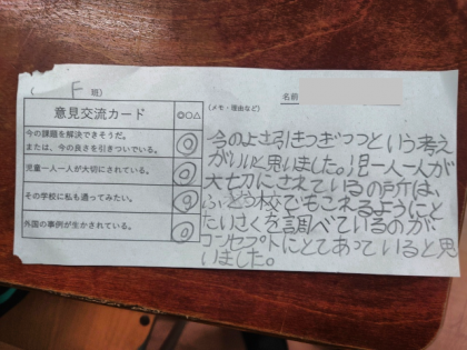今日の発表は、「いろいろな国の文化や歴史を尊重できる学校」「動植物とふれ合ってその大切さを知ることができる学校」「楽しみながら自分に合った学びができる学校」を考えて発表していました。