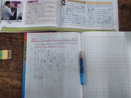 社会科の時間は、コンビニエンスストアの売り方の工夫を資料で調べて、スーパーマーケットとどんなところがちがうのか考えました。