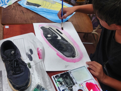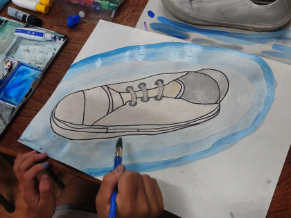 図工科の時間は、自分のくつをサインペンで線描し、絵の具で着色しています。