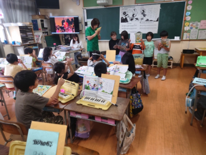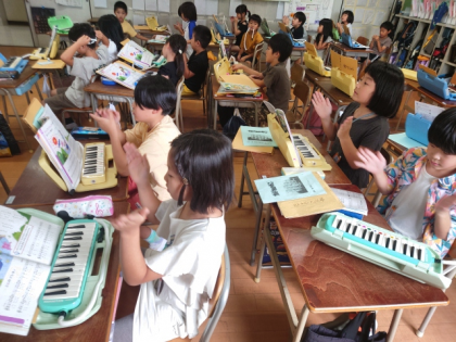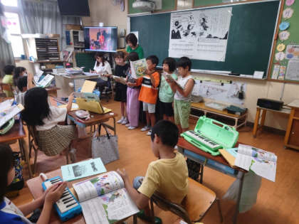 音楽科の時間は、教科書の「にじの クレヨン」をグループごとにみんなの前で歌いました。