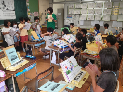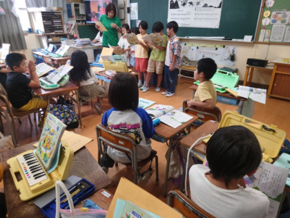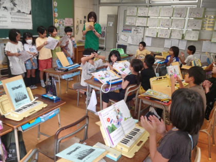 音楽科の時間は、教科書の「にじの クレヨン」をグループごとにみんなの前で歌いました。
