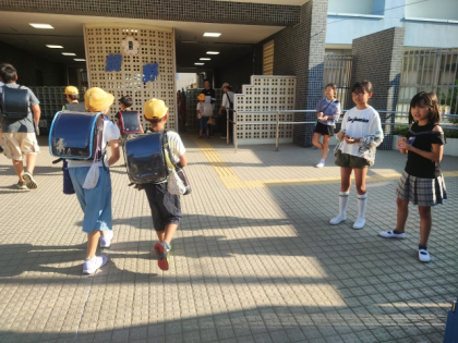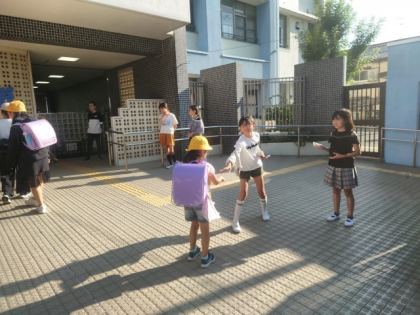大きな声で元気よくあいさつできた人に「葉っぱ」や「花」を渡しています。
