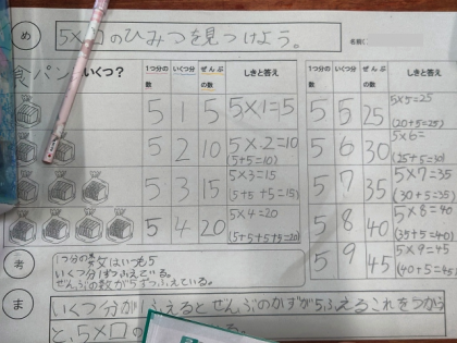 5の段の九九の答えにはどんなきまりがあるのか、気付いたことをワークシートに書いて話し合いました。