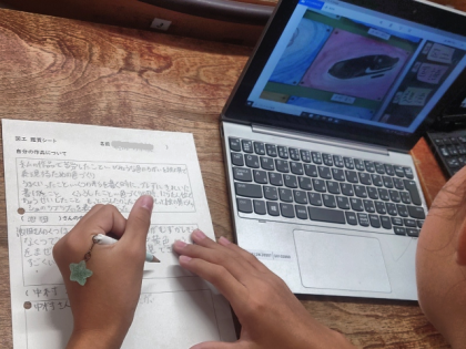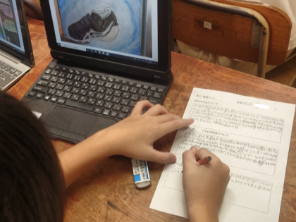 今日は、友達の作品を見て思ったことや感じたことをワークシートに書きました。