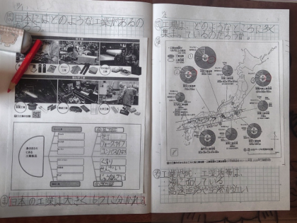 社会科の時間は、日本の工場は、どのようなところに多く集まっているのか教科書などの資料をもとに調べました。