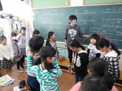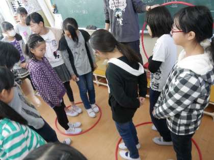 大小のフラフープに3人ずつはいっています。どちらが混んでるのかな?わかるよね。