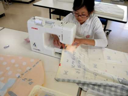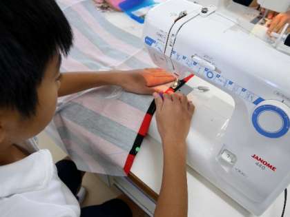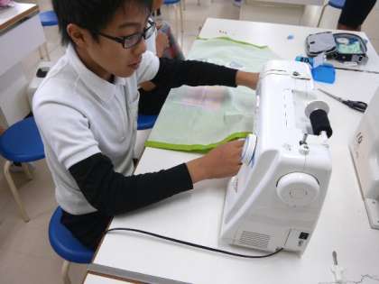 6年生の家庭科でエプロンを作っています。いよいよミシンがけです。使い方おぼえていたかな。