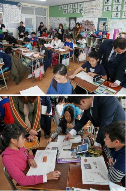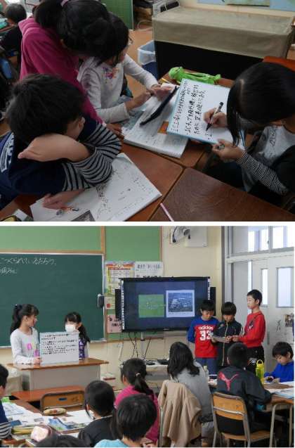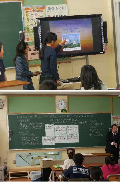 5年社会の授業で、校内研究授業をおこないました。タブレットやホワイトボードを使ってまとめたり、発表しています。