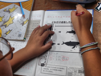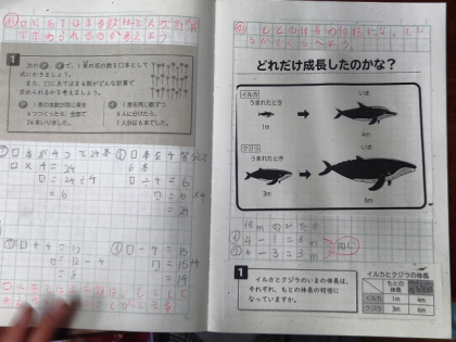 算数科の時間は、「イルカとクジラのいまの体長は、それぞれ、もとの体長の何倍になっているか」という問題について考えました。