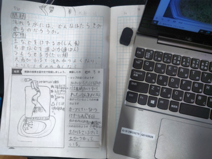流れる水のようすを学習用端末で撮影し、実験の結果を図や文で記録しました。