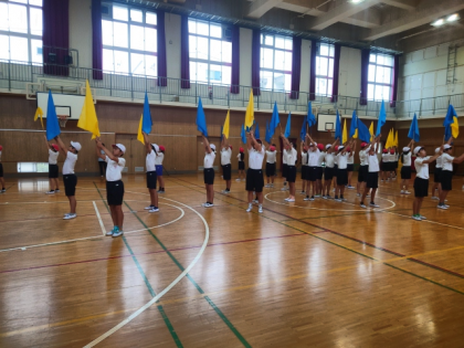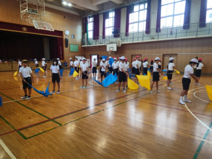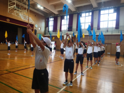 運動会に向けて、団体演技のフラッグの練習をしています。