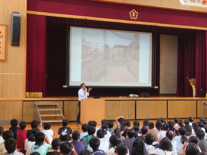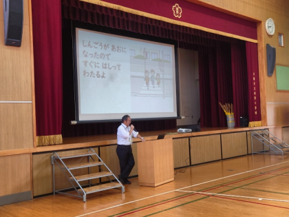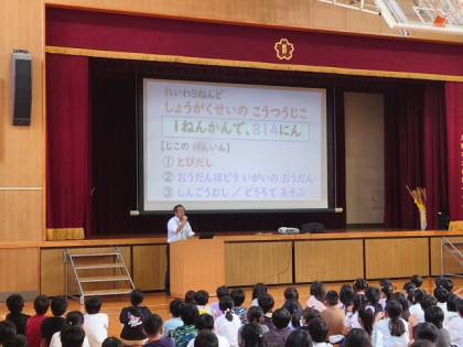 「最近、地域の方やお家の方から、みなさんが登校しているとき、交通ルールを守っていなくて、あぶないなあと思うことがたくさんあるという連絡をいただいています。
