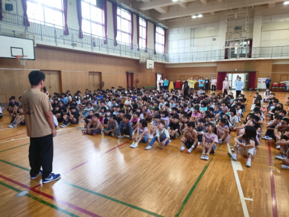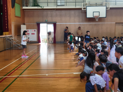 校長講話に続いて、当番から今月の生活目標「ろうか・階段は右側を歩こう」について、校舎内のけがが増えていることから、教室、ろうか、階段などでは落ち着いてすごすように子どもたちに話をしました。