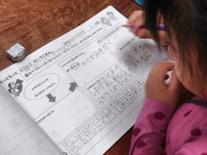 子どもたちから、『みんなでにこにこ』は、「家族にお礼のお手紙を書く」「一緒に遊ぶ」「学校の話をする」など、『じぶんでにこにこ』は、「一人で起きる」「自分のお皿を洗う」「お片づけをする」など考えていました。