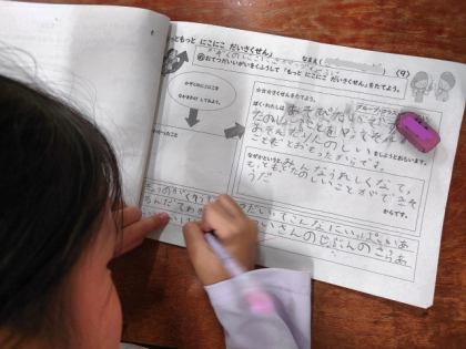 生活科の時間は、家族の「にこにこ」が続くようにするために、お手伝い以外の「もっとにこにこ大作戦」を考えました。