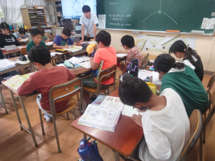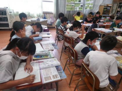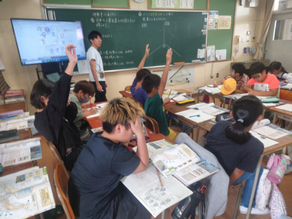 社会科の時間は、地図を見ながら、日本の工業地帯について調べ、どうして太平洋ベルトに工場が集まっているのか考えました。