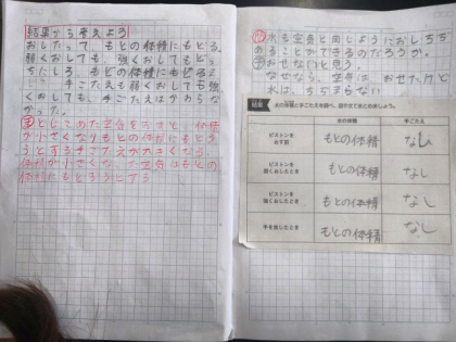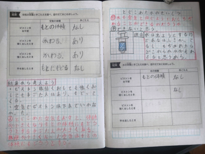 理科の時間は、空気と同じように水もおしちぢめることができるのかについて実験で調べました。