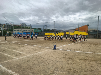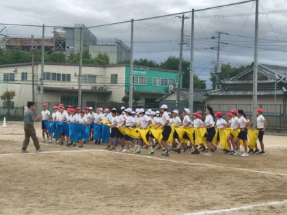 運動会に向けて、運動場で団体演技のフラッグの練習をしています。