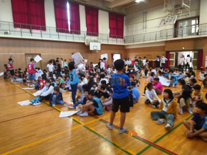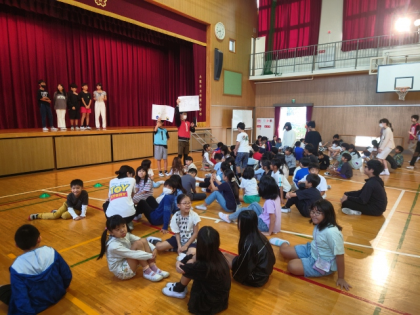 児童集会は、ドレミ班(たてわり班)ごとに講堂に集合して行いました。