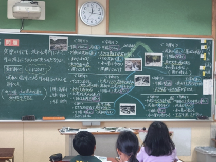 理科の時間は、実際の川が流れる場所によって川の様子にちがいがあるのかどうか、教科書等を使って調べ、ノートにまとめました。