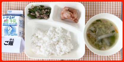 今日の献立は、鶏肉のチリソース焼き・焼き豚のスープ・ツナとさんどまめのオイスターソースいため・ごはん・牛乳でした。