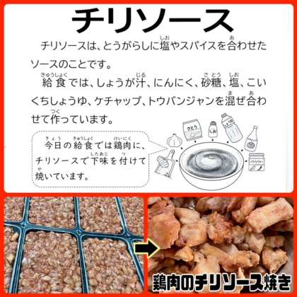 「鶏肉のチリソース焼き」は、鶏肉にしょうが汁、にんにく、砂糖、塩、こいくちしょうゆ、ケチャップ、トウバンジャンで下味をつけ、焼き物機で焼いています。