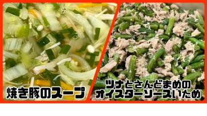 「焼き豚のスープ」は、焼き豚、はくさい、たまねぎ、にんじん、えのきたけ、青みににらを使用しています。