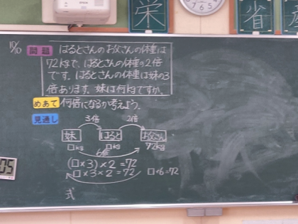 「はるとさんのお父さんの体重は72kgで、はるとさんの体重の2倍です。はるとさんの体重は妹の3倍あります。妹の体重は何kgですか。」という問題について考えました。