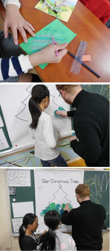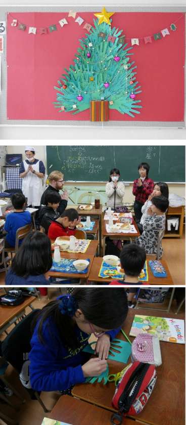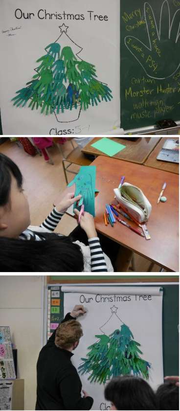中学校からきていただいている、英語ネイティブのメイソン先生の授業がありました。4年生の教室で給食をたべました。5年生の授業は、緑色の画用紙を手形に切り抜いて、色をぬって英語で願いごとをかきこみました。「I want to 〜」と書いています。みんなほしいものたくさんありますね。最後にツリーのかたちに貼りつけて完成です。