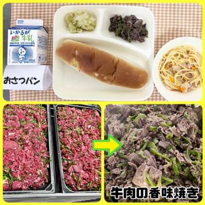 今日の献立は、牛肉の香味焼き・トマトのスープスパゲッティ・キャベツのサワーソテー・おさつパン・牛乳でした。