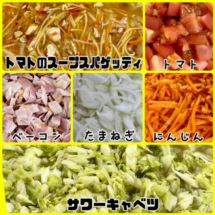 「トマトのスープスパゲッティ」は、にんにくを香りよくいためて風味を増し、鶏肉とベーコンで旨みを出しています。