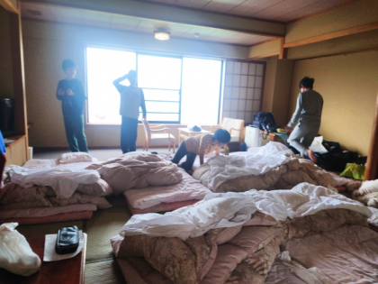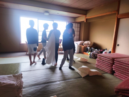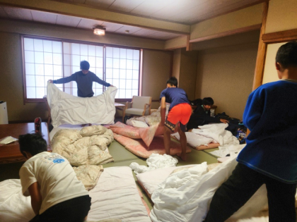 子どもたちは、寝具の片付けと身支度をしています。