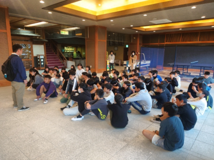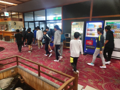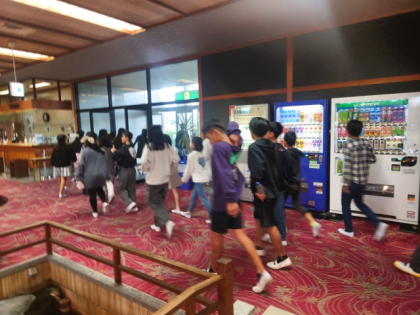 昨夜の段階では、館内での朝会に変更する予定でしたが、早朝に雨がやんだため、予定を再変更し、砂浜で朝会を行うことにしました。