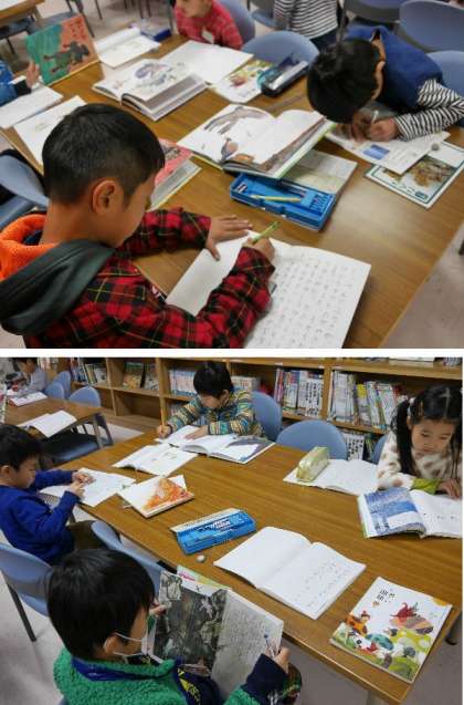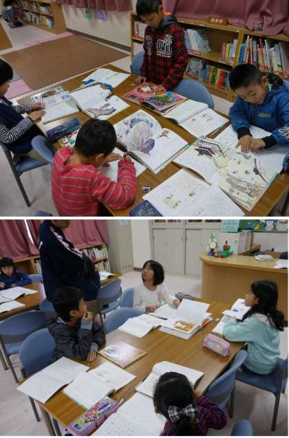 2年生の国語では「かさこじぞう」の学習をしています。図書室でほかのむかし話を探して読んでいます。すきなお話をえらんで、ともだちに紹介する文を考えています。