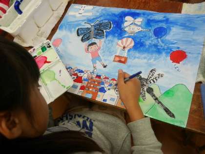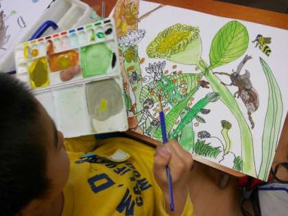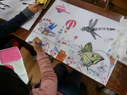 3年生が描いている昆虫の絵の最後の仕上げをしています。とてもいいしあがりになりそうです。
