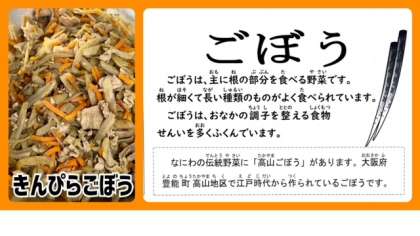 「きんぴらごぼう」は、豚肉、ごぼう、にんじんをいため、砂糖、こいくちしょうゆで味つけしています。